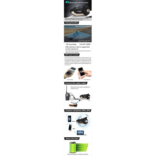 | Usage | connected to mobile phone/MP3/GPS via Bluetooth |